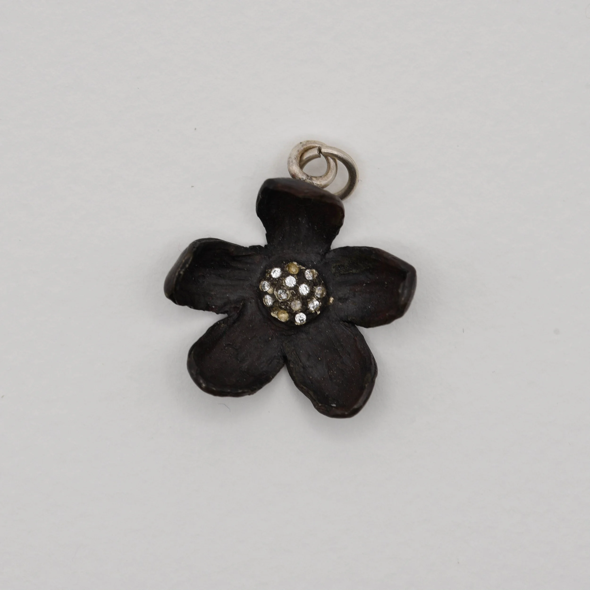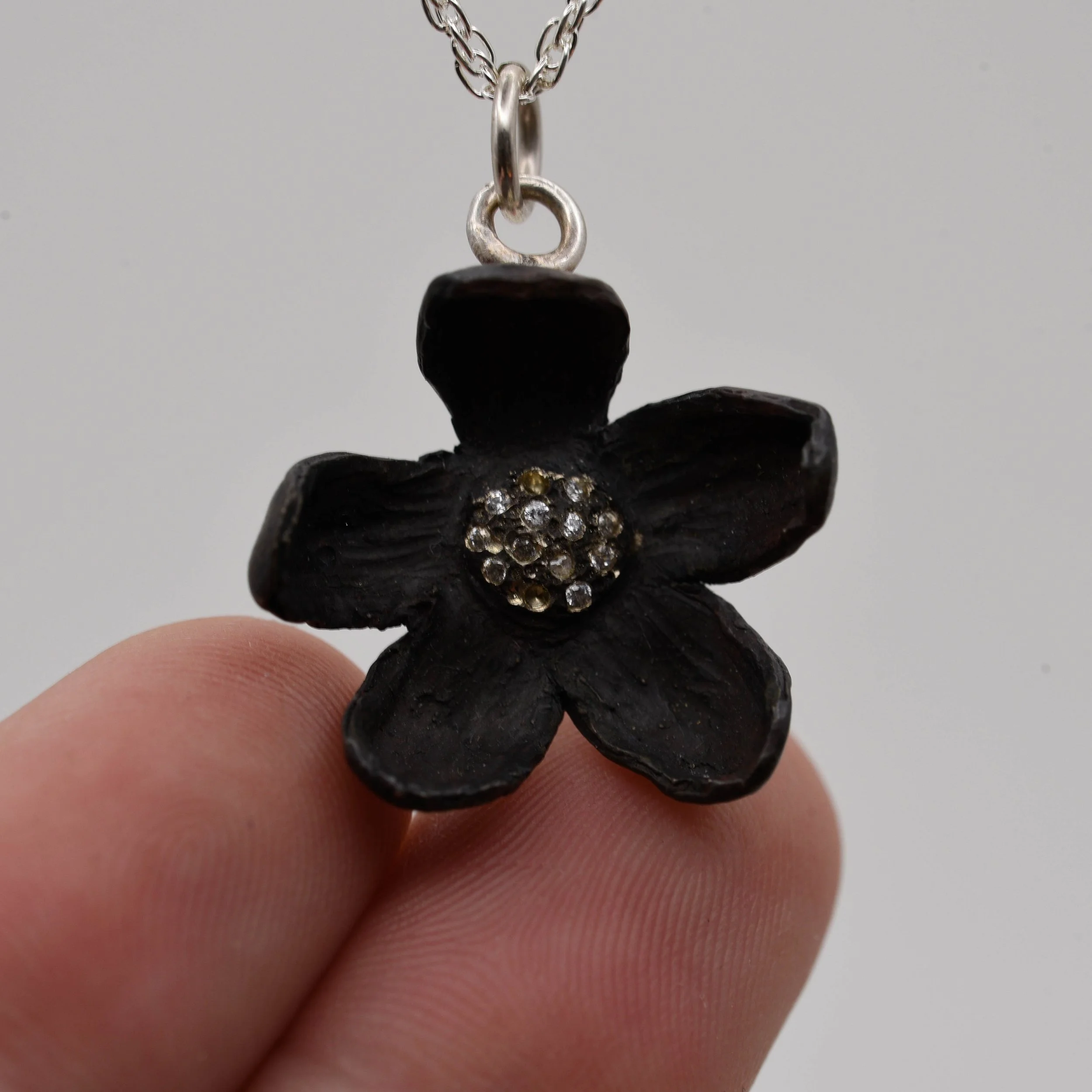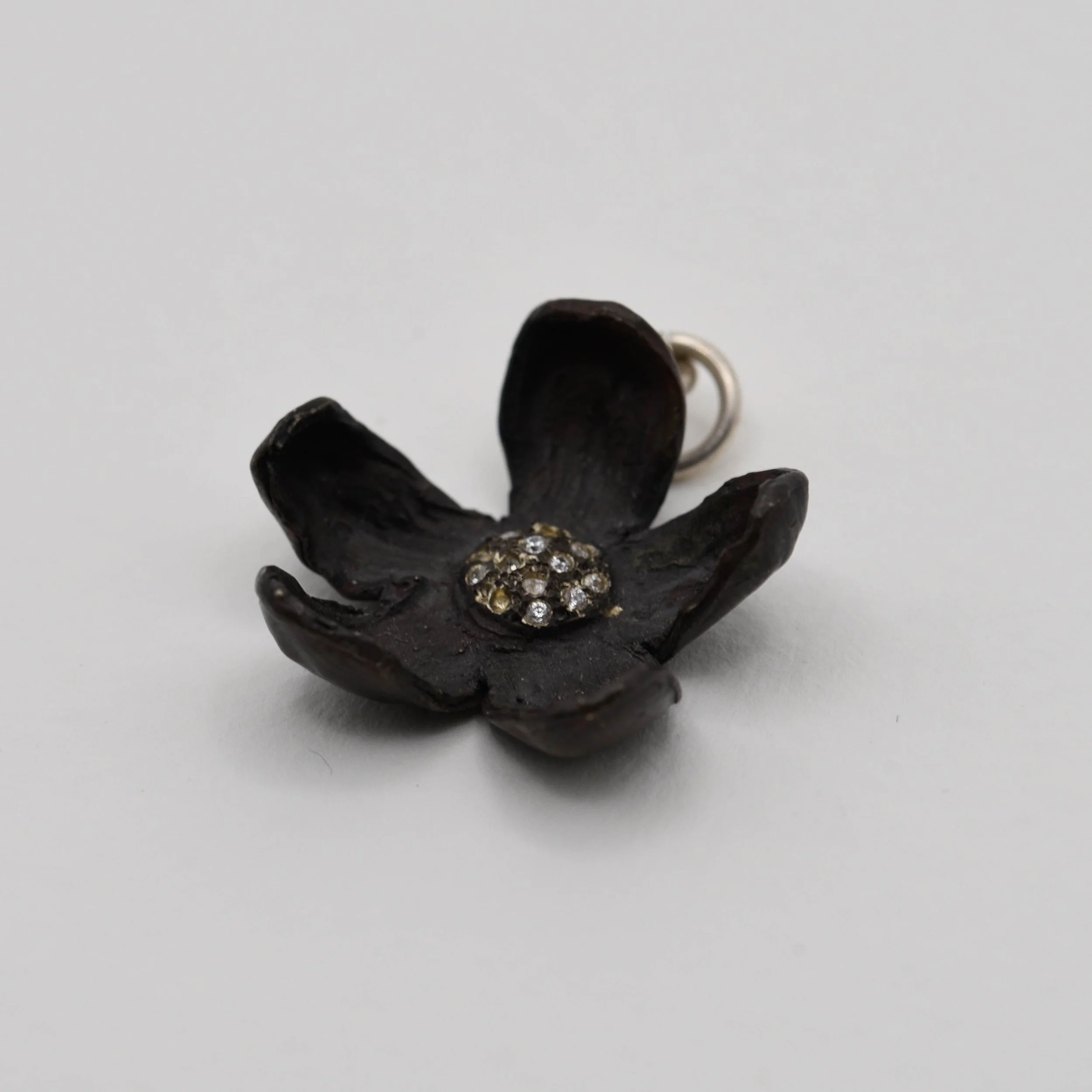 This blossom flower has been sculpted our of wax and then cast in white brass. The stones are CZ diamonds.