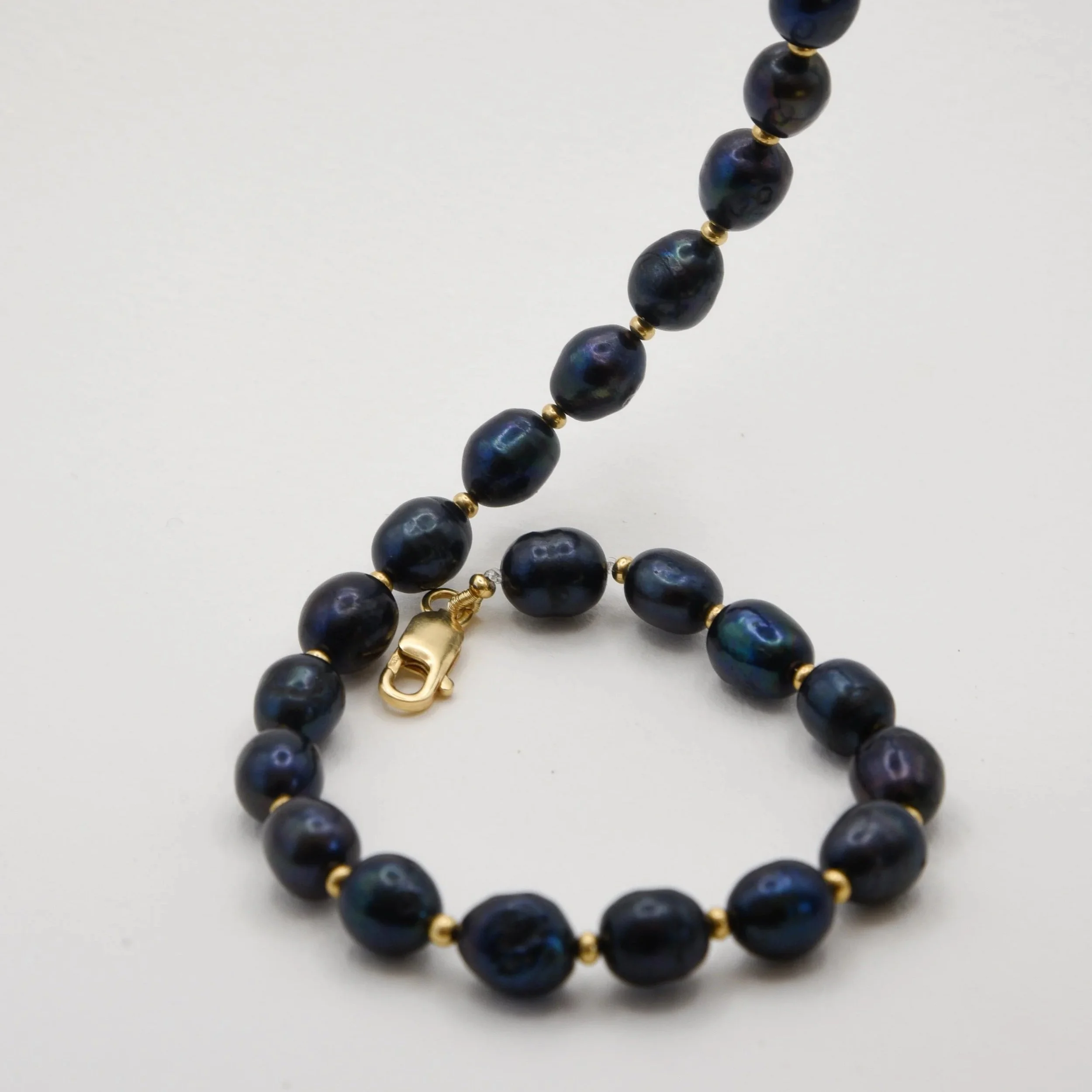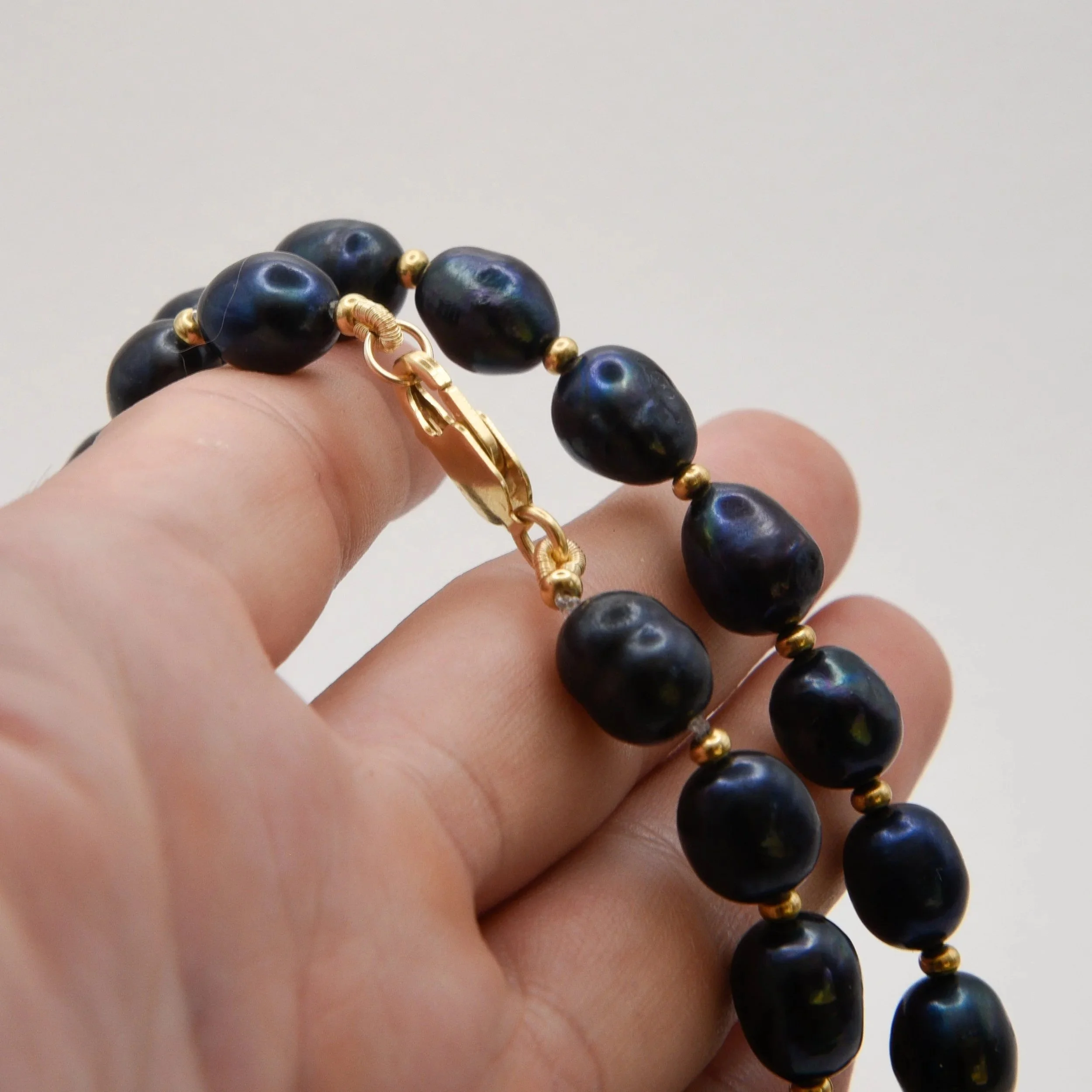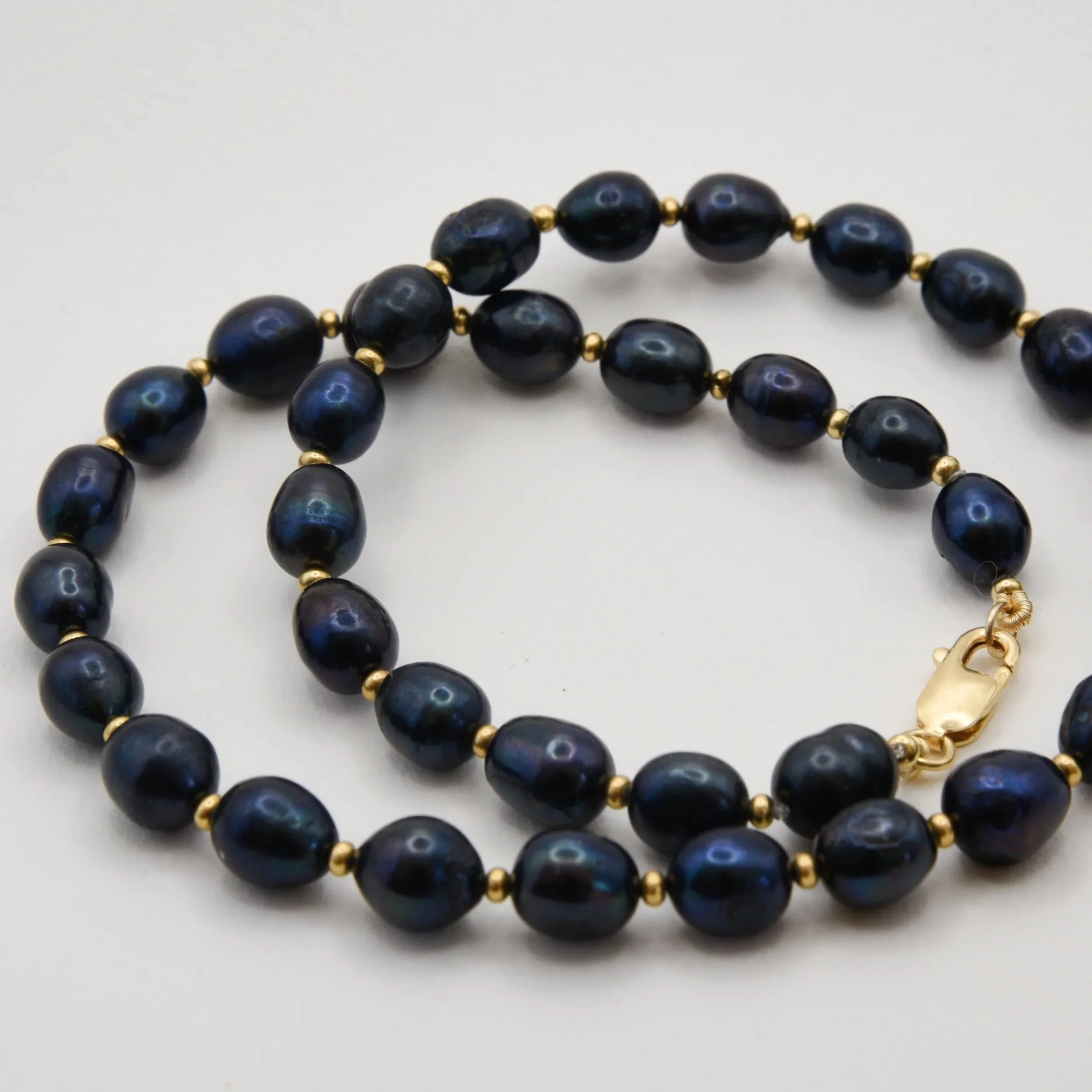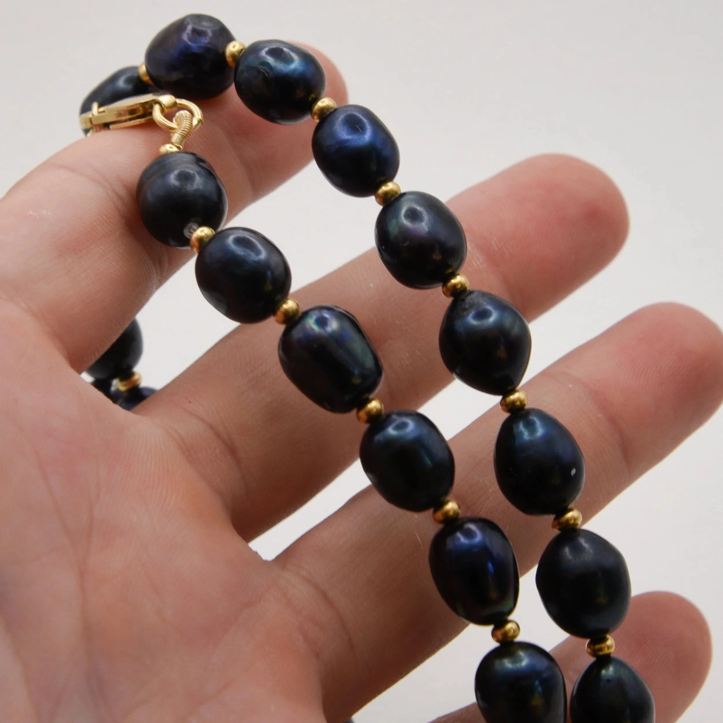 Beautiful fresh water pearls in a deep blue colour paired with some 14k gold fill beads and clasp.