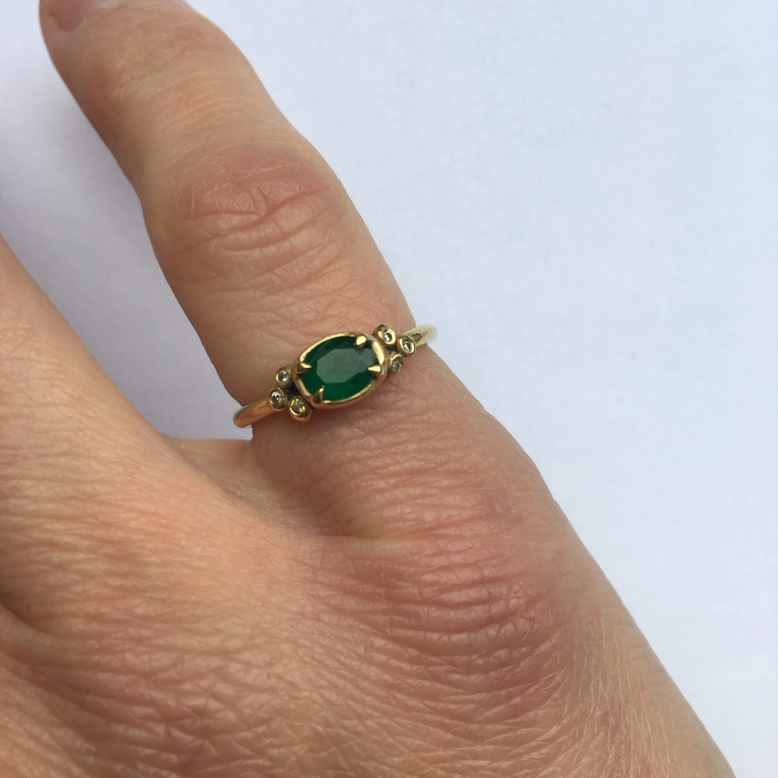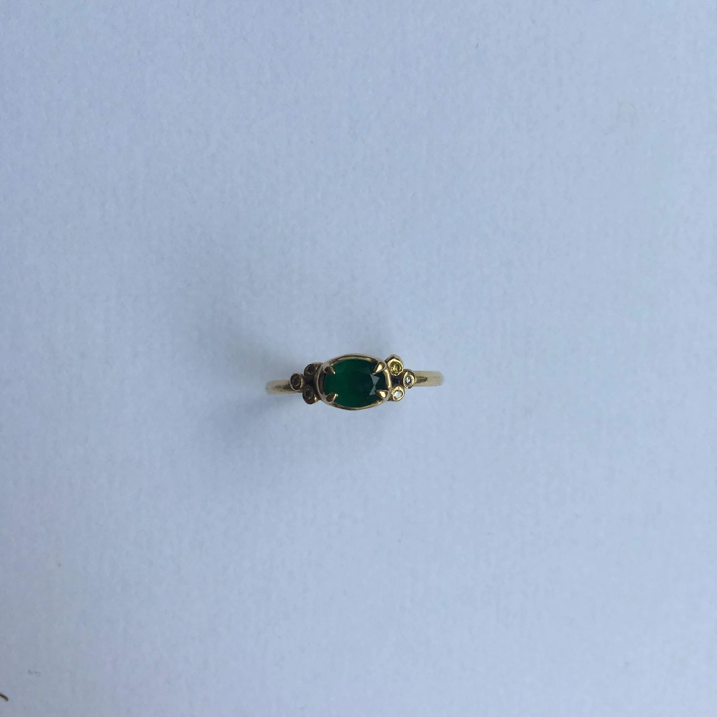 This engagement ring features a bright central stone that catches the eye. Around it are smaller, sparkling diamonds that add extra shine and elegance. You can choose a unique main gem to express your style while keeping a nod to tradition with the classic engagement stone. This handmade ring contains my favourite motif, a star-like constellation of stones which always signifies eternal connection, its a nice mix of custom and traditional makes the ring special and timeless.
