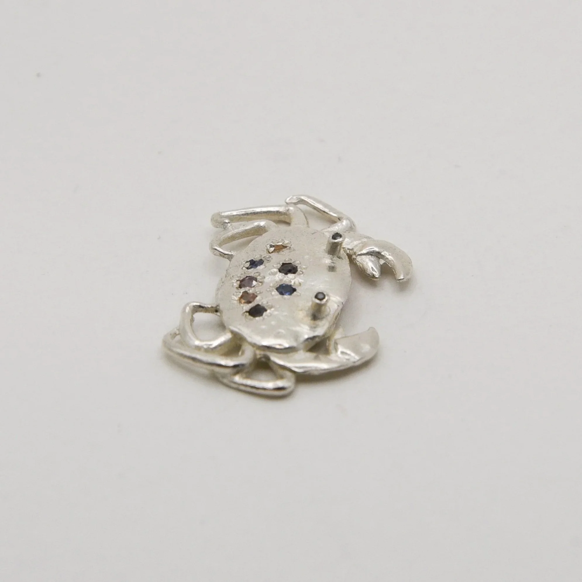 This little charm has a pearl head, an opal thorax and a cabochon peridot abdomen. The metal is solid silver and the details are etched into the disc and coloured in with a sulphuric oxide.